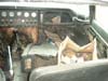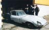 ![]() Tuesday april 29th 2003: Finally there is the moment to pick up the car. We have arranged a van and a trailer. Rope, tools. My brother will drive behind us on his motorbike. On the way we catch up my colleague in Eindhoven. He and Angeli will take pictures of the entire operation. On our way we drink a cup of coffee and we are all in a good mood. When we arrive in Moerdijk we follow the marks that leads us to a small office where I have to sign all kinds of paperwork. Meanwhile Angeli, my brother and colleague go downstairs to search the E-type. The first thing we see is the hood. It's taped on the car. The car looks very small. There are holes in the seats, water on the floor and buckets boxes with parts, srews, rubbers etc. All wet......! But she looks great!! We can smell her, touch her. Fantastic. What's the true collour? Partly it's black. There is a guy standing next to the car and asks us what we think about the state of the car. He doesn't believe in a total recovery.The trunk is full of chromium parts like bumperparts, spare wheel, and one wired wheel extra. When we look to the car more often, it doesn't seems to look very bad at all. From the beginning I was aware of the condition of the car. It's nice to have the Californian numberplates. It was very hard to push and pull the car on the trailer, because the front suspension was bend. Because the hood was taped on the car we tried to get it in the van but unfortunately it didn't fit. A couple of hours later we arrive at home. The car exactly fits in the garage. We also found a photo, coins, stamps and a telephonelist. We wonder what's the entire history of the car. What happend the last 36 years with the car and his owners?